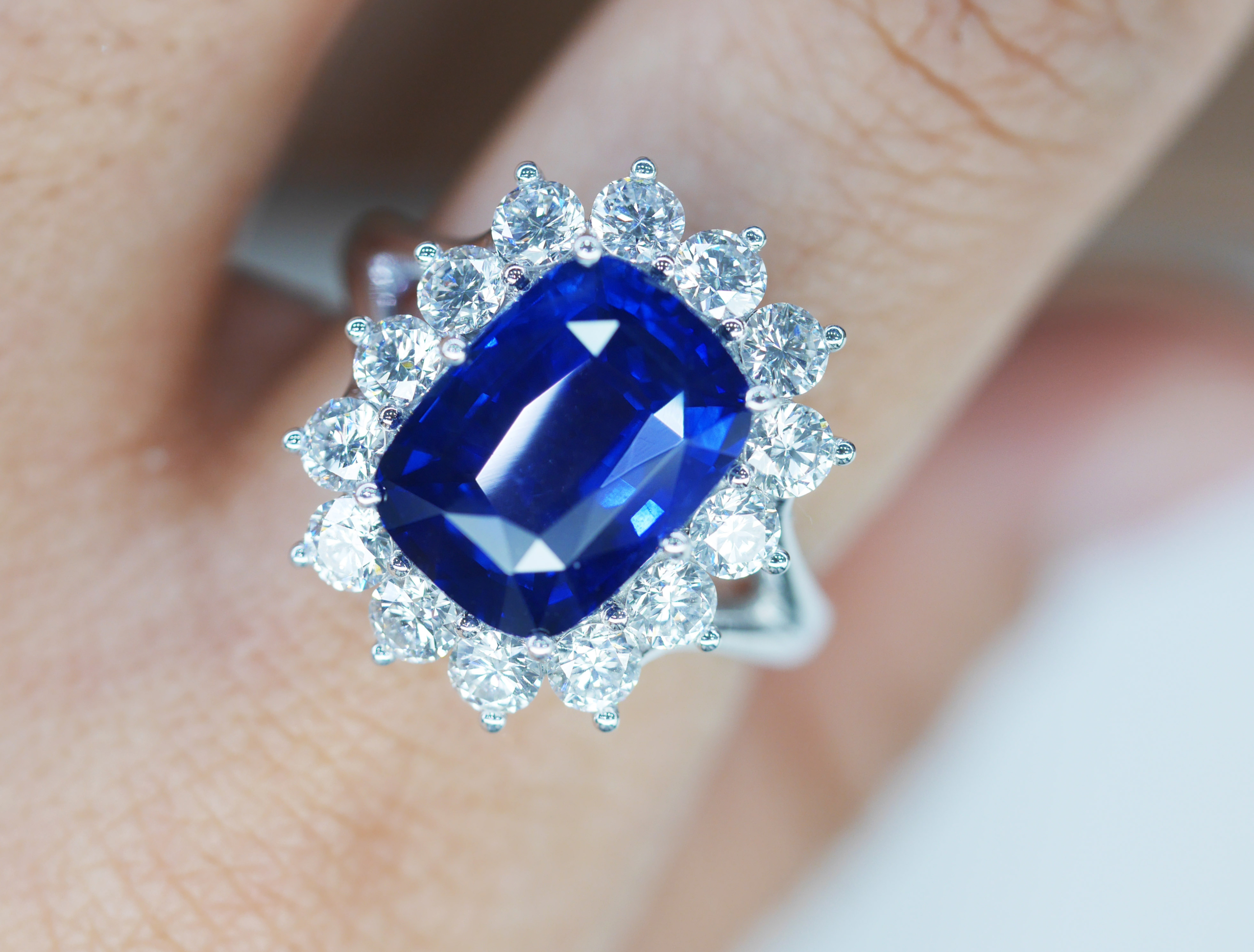 แหวนไพลินเผาเก่าล้อมเพชร สี “Royal Blue” GRS Swisslab certificate”